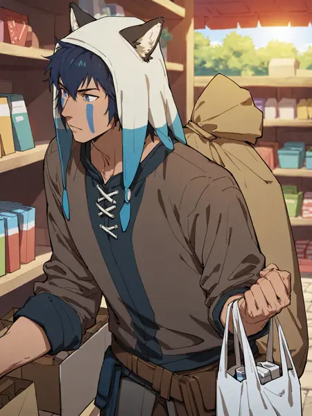 棕色衬衫,棕色裤子,动物耳朵,连帽,面部彩绘,背包,