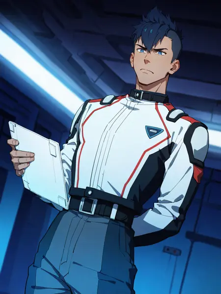 Messer Ihlefeld, 1boy, solo, male focus, dark skin, blue hair, blue eyes, bara,