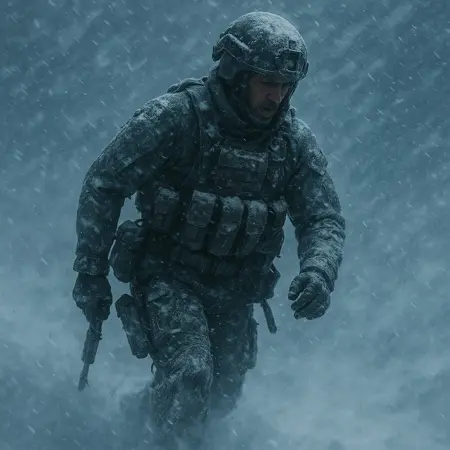 stormy_snowfall, soldier walking in blizzard, chaotic snowflakes,