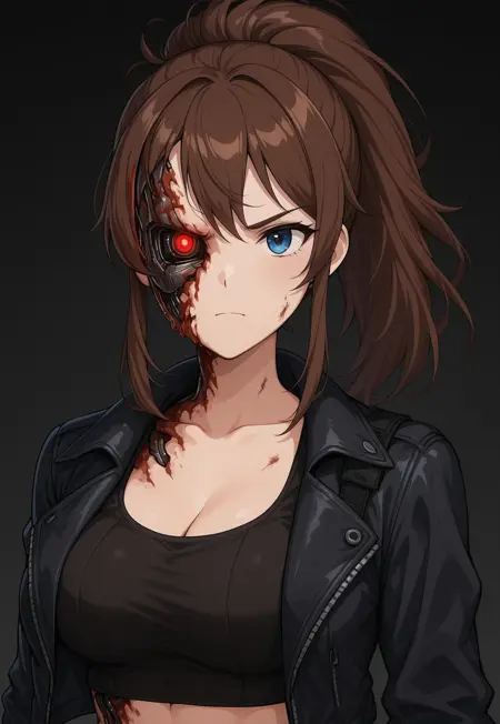 Termitanmb2, cyborg girl, female terminator, damaged android face, glowing red cybernetic eye,