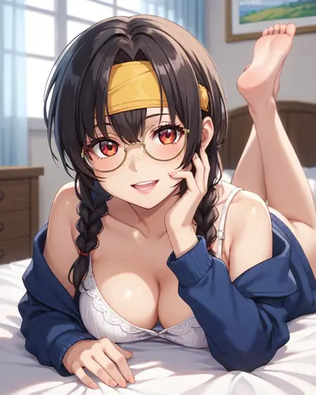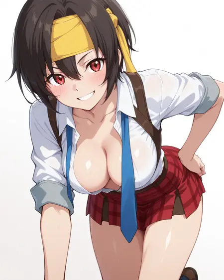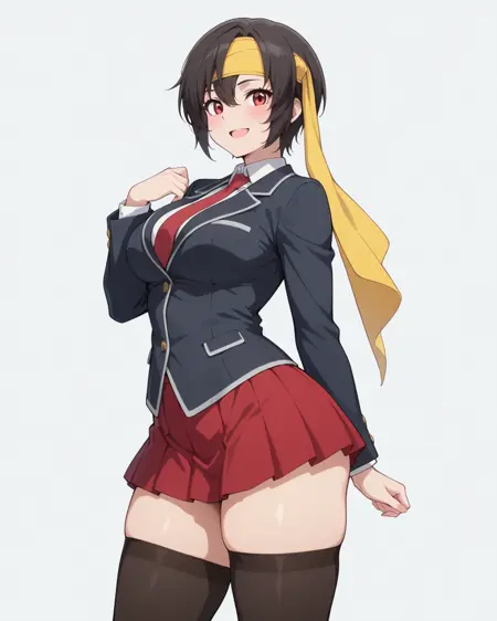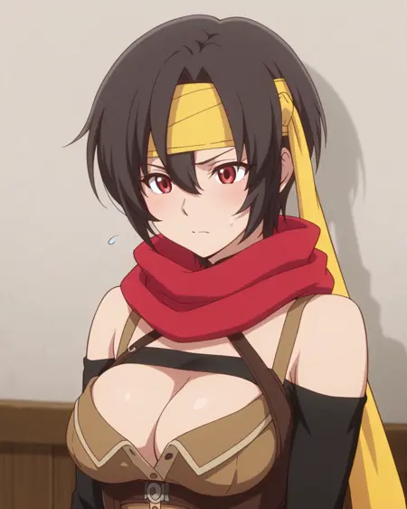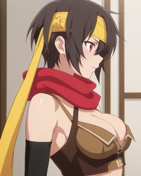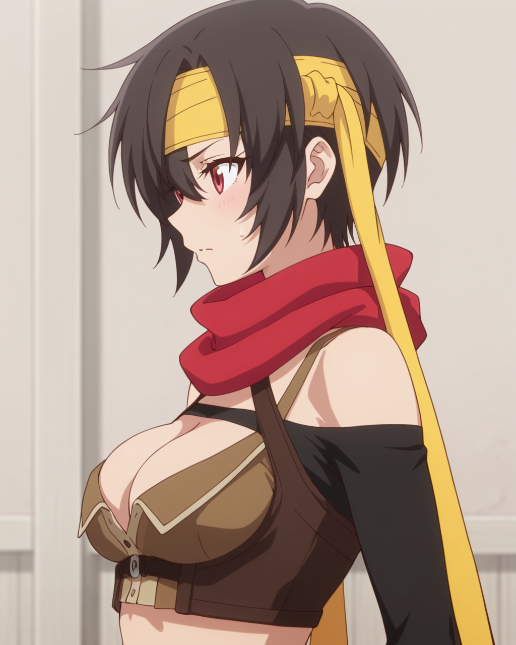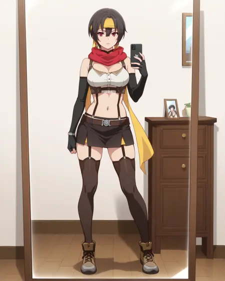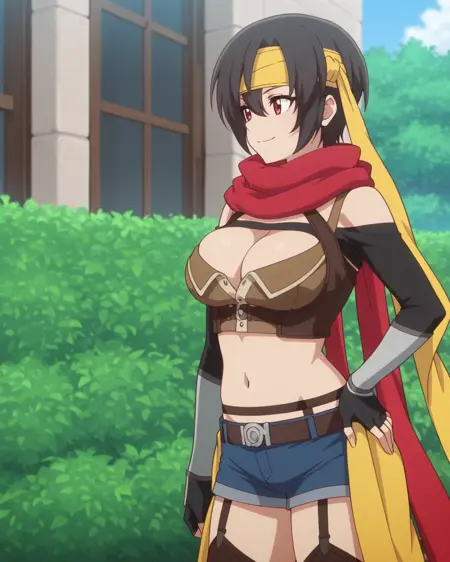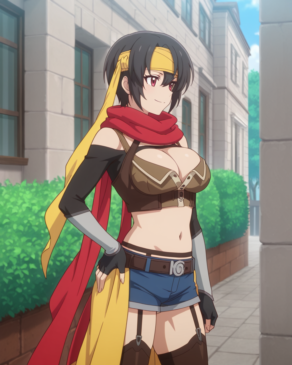 Bandana, 검은 머리, 단발, 붉은 눈, 가슴, 중간 크기 가슴, 1소녀, 혼자, 배꼽, 가슴 선, 빨간 스카프, 장갑, 반바지, 음부, 손가락 없는 장갑, 스카프, 허벅지 양말, 머리띠, 허리, 벨트, 가터 스트랩, 미소, 검은 장갑, 크롭 탑, 짧은 반바지, 큰 가슴, 입을 닫음, 실외, 파란 반바지, 카우보이 샷, 검은 허벅지 양말, 손을 허리에 얹음, 밴다나, 갈색 벨트, 낮, 검은 벨트