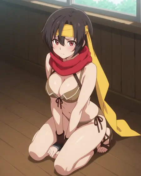 Bandana, 검은 머리, 단발, 붉은 눈, 가슴, 중간 크기 가슴, 1소녀, 갈색 비키니, 가슴 선, 사이드 타이 비키니 하의, 리본, 전체 신체