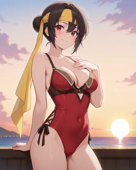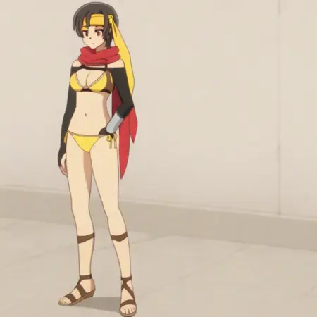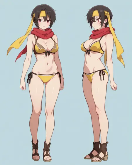 Bandana, 검은 머리, 단발, 붉은 눈, 가슴, 중간 크기 가슴, 1소녀, 노란색 비키니, 가슴 선, 사이드 타이 비키니 하의, 리본, 전체 신체