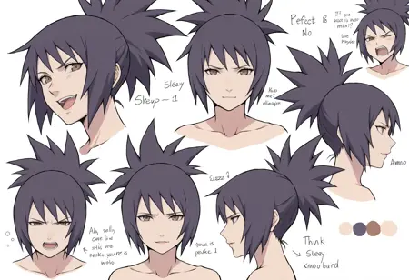 Appearance: AMNO1,1girl,brown eyes,black hair,purple hair,short hair,long hair,ponytail