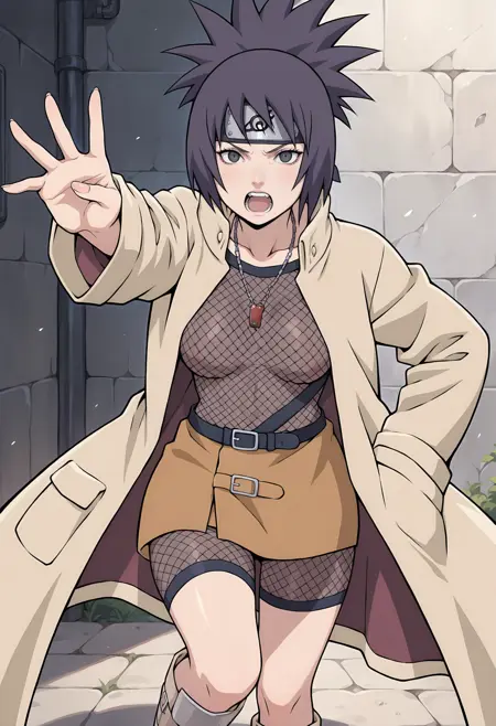 Outfit: forehead protector,headband, necklace,jewelry,breasts,large breasts,coat,trench coat,open clothes,fishnets,bodysuit,fishnet bodysuit,belt,shin guards,armor,skirt,sandals,toeless footwear