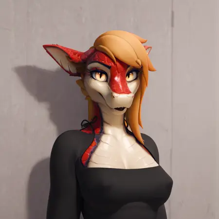 prompt: female, red and black scales, orange hair, long snout