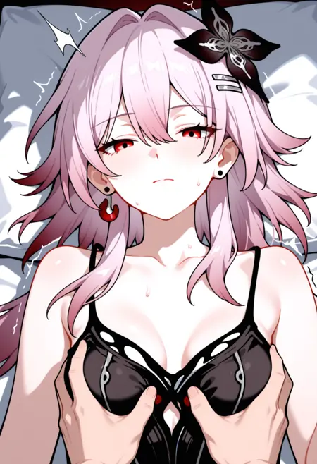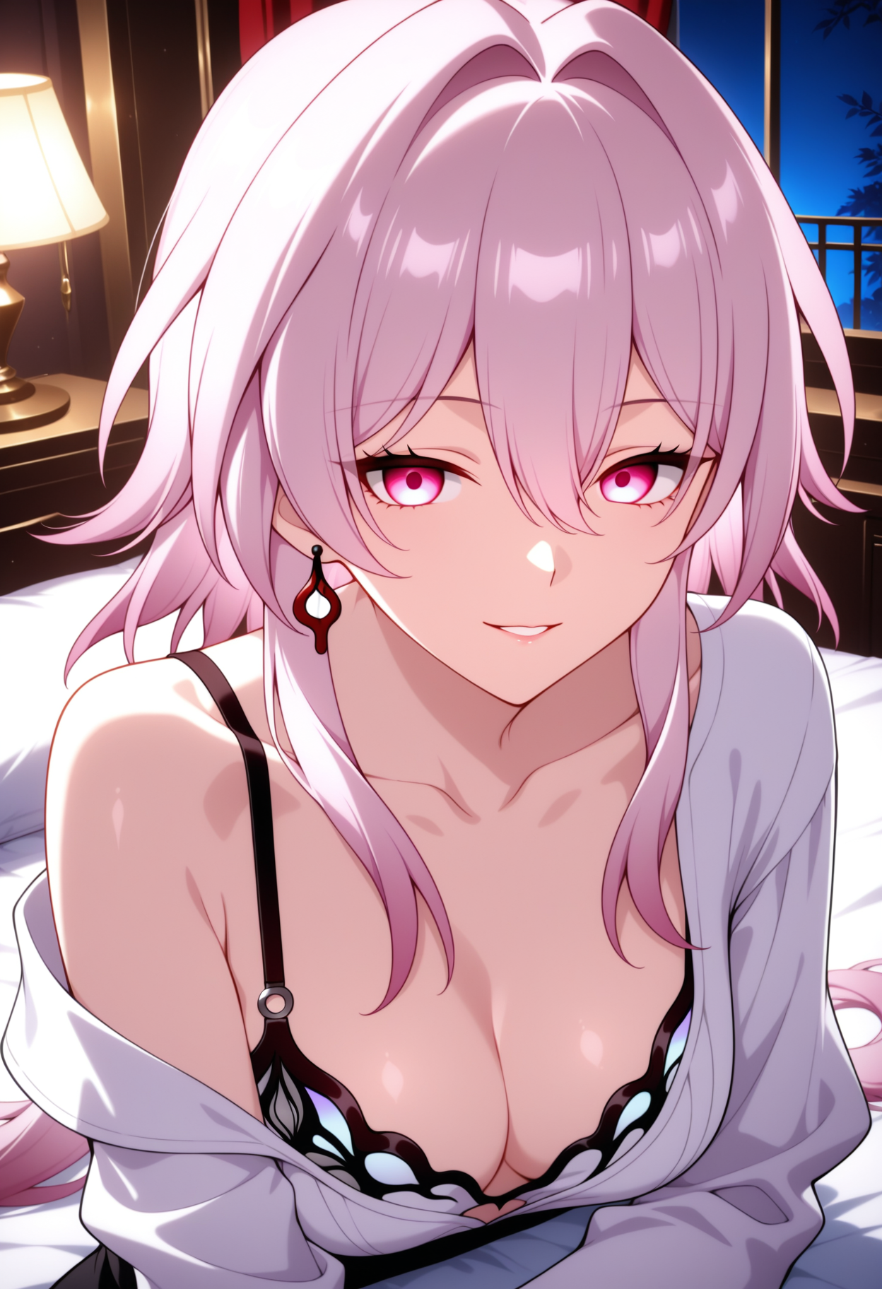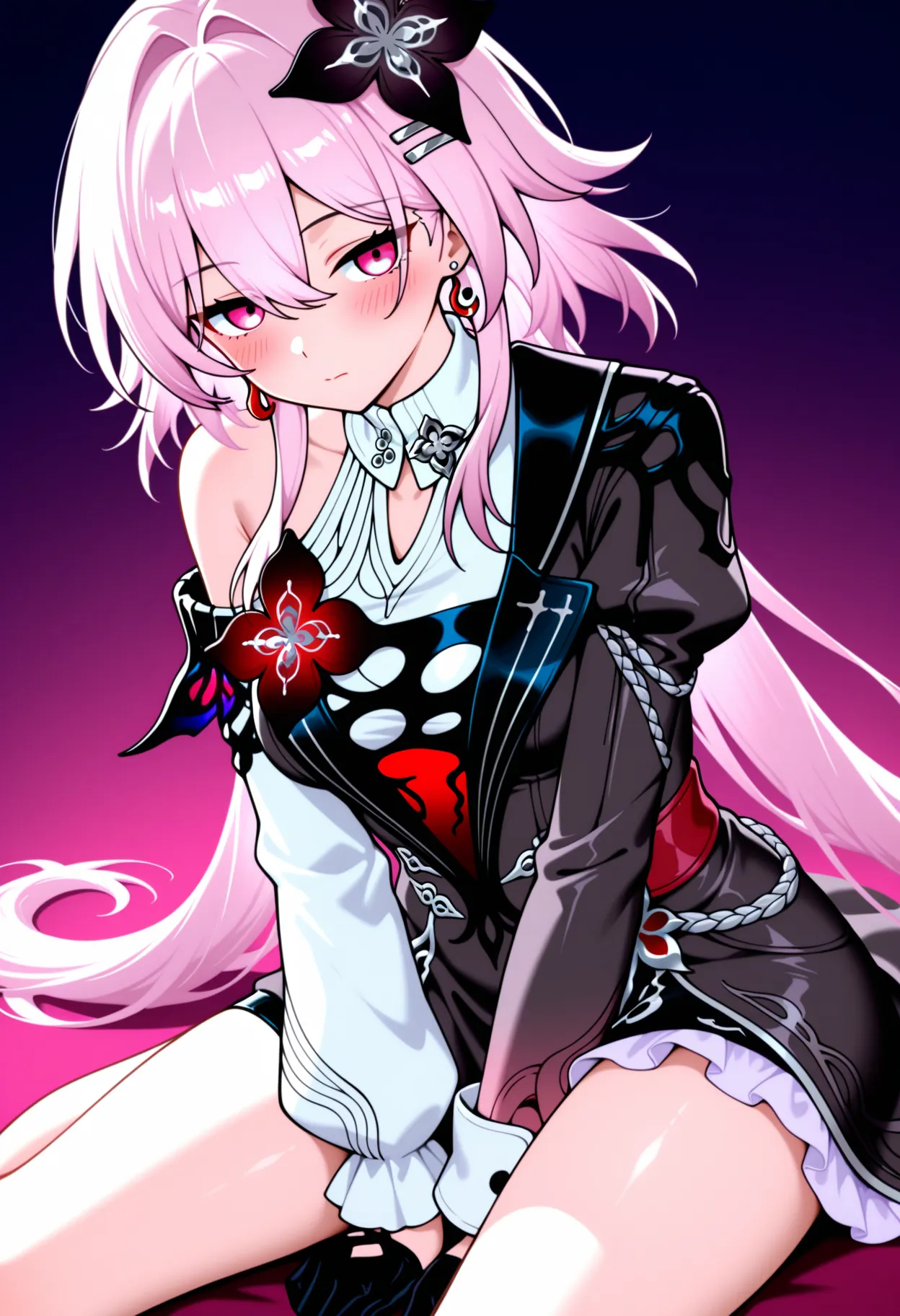 Evernight, 1girl, solo, gloves, black gloves, looking at viewer, pink eyes, sitting, earrings, long sleeves, jewelry, flower, closed mouth, breasts, hairclip, hair between eyes, single bare shoulder, white shirt, shirt, thighs, dress, frills, very long hair, black jacket, simple background, blush, jacket, between legs, thin lines