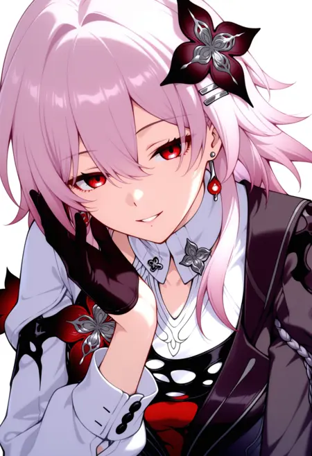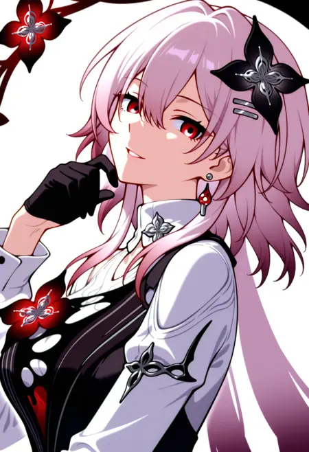 Evernight, 1girl, solo, looking at viewer, jewelry, earrings, smile, upper body, flower, long sleeves, breasts, hair between eyes, hairclip, shirt, parted lips, white shirt, white background, black gloves