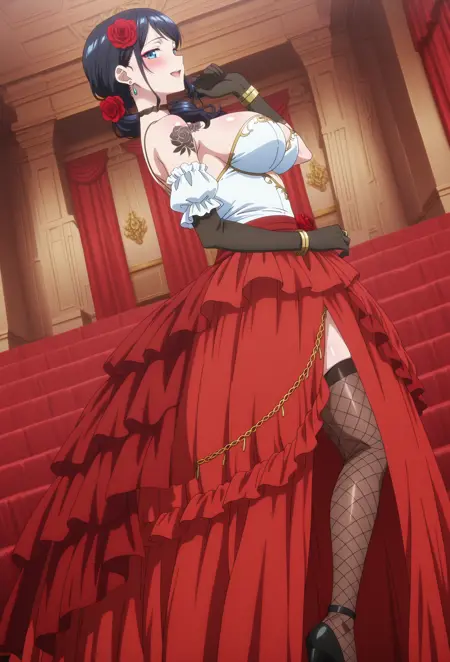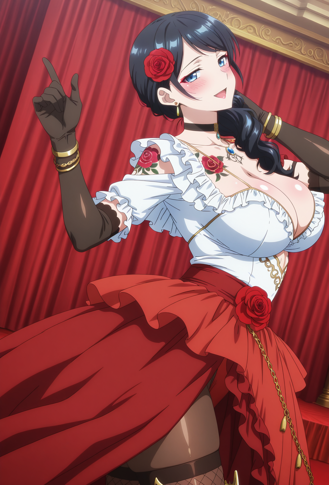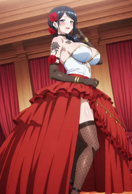 shr_ge, 1girl, 单人, 高成熟女性, 大乳房, 巨乳, 大屁股, 巨臀, 黑发, 蓝眼, 化妆, 马尾, 低马尾, 头发垂肩, 发饰, 红花, 玫瑰, 头发花饰, 深V领, 项圈, 纹身, 花纹身, 翅膀纹身, 手臂纹身, 肩部纹身, 胸部纹身, 乳沟, 不对称服装, 单肩裸露, 白色连衣裙, 连衣裙, 无肩带连衣裙, 手镯, 手套, 珠宝, 戒指, 短袖, 连裤袜, 耳环, 荷叶边, 黑色手套, 肘部手套, 项链, 高跟鞋, 选美裙, 红色裙子, 金链, 长裙, 鱼网袜, 黑色过膝袜, 鱼网过膝袜, 不对称过膝袜, 黑色内裤, 黑色内裤, 蕾丝边内裤, 微型内裤,