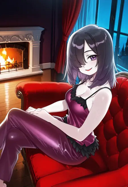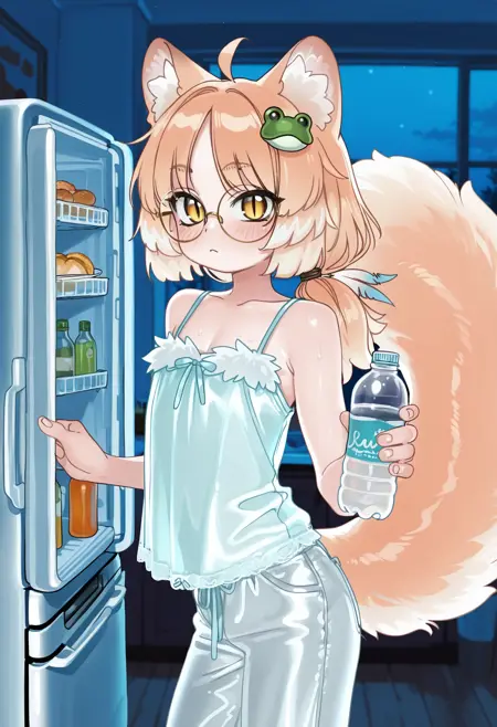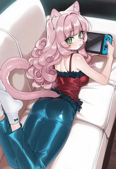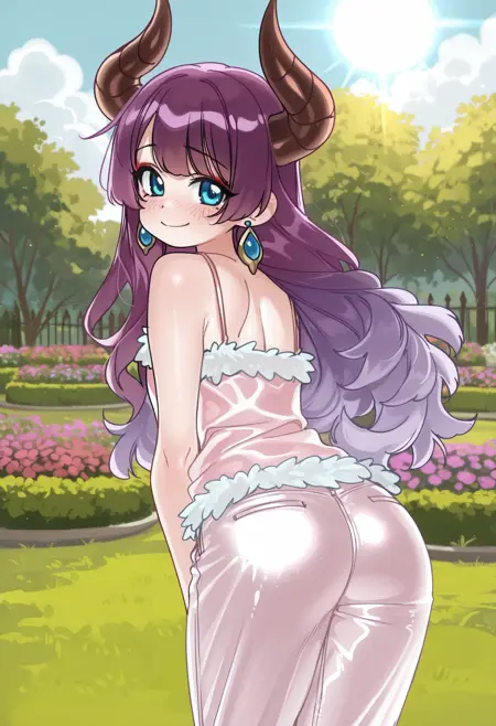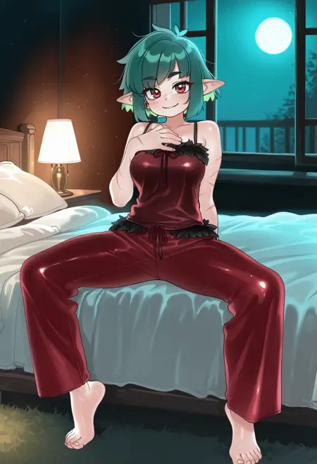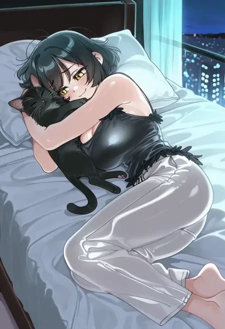 触发词:吊带衫、裤子、丝绸吊带衫、丝绸裤子、无袖、羽毛装饰、吊带衫上的羽毛,