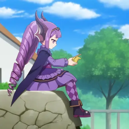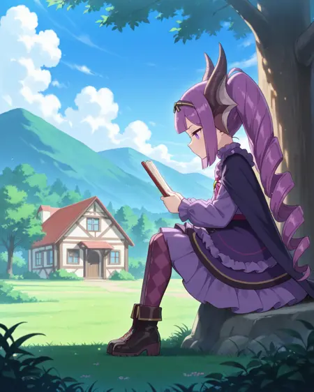 • 希尔德加德,紫色头发,长发,非常长的头发,双马尾,紫色眼睛,角,恶魔角,1个女孩,独奏,户外,独奏,天空,坐着,白天,连衣裙,云,蓝天,手持,格子图案服装,发带,丝袜,紫色连衣裙,格子图案裤袜,长袖,荷叶边,钻头发型,房子,斗篷,侧面视角,黑色鞋履,靴子,侧脸,树,齐刘海,闭嘴