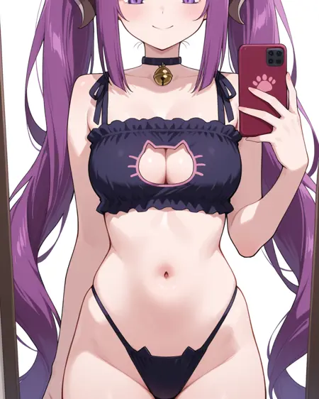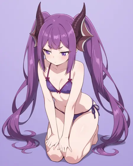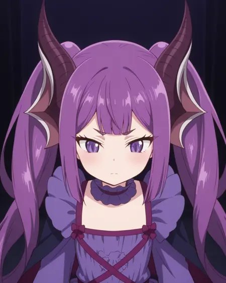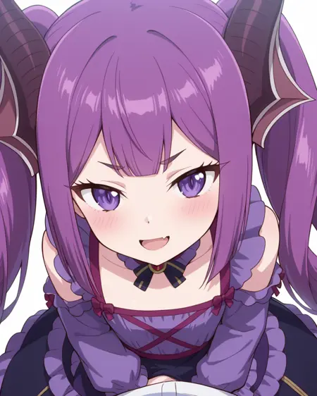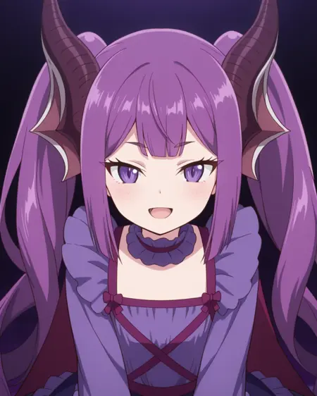 • 希尔德加德,紫色头发,长发,非常长的头发,双马尾,紫色眼睛,角,恶魔角,1个女孩,独奏,微笑,张开嘴,看着观众,长袖,:d,连衣裙,荷叶边,上半身