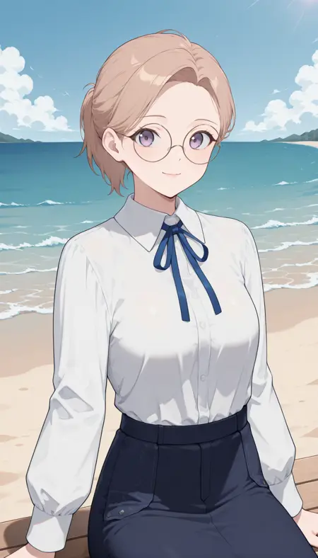 服装: 圆形眼镜,蓝色脖饰,蓝色颈带,有领衬衫,长袖,蓬松袖子,长裙,铅笔裙,连裤袜,高跟鞋,棕色鞋履