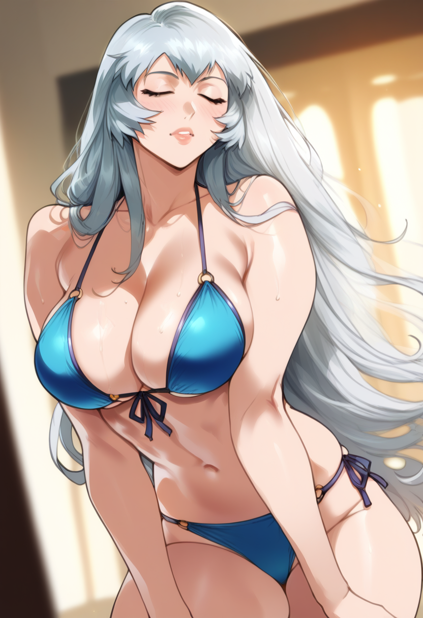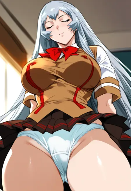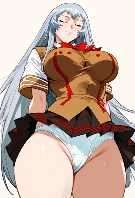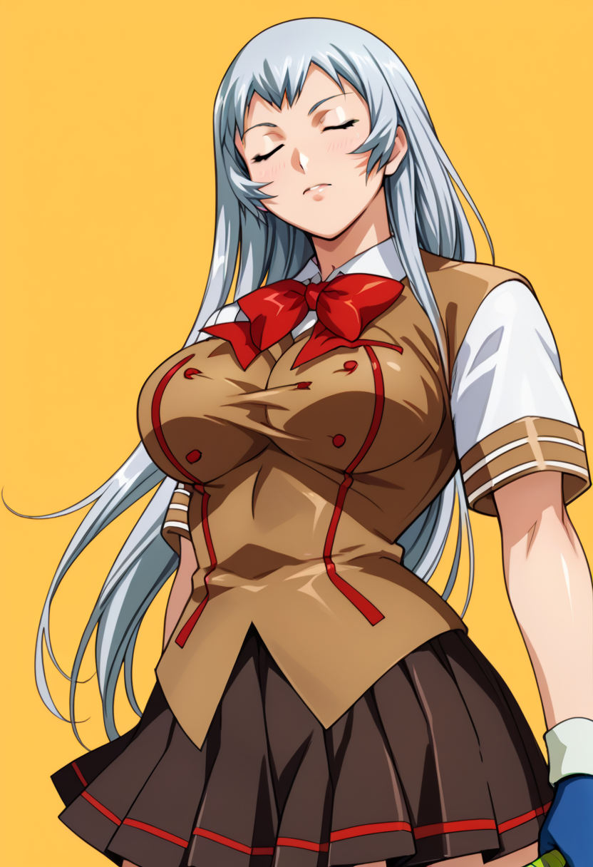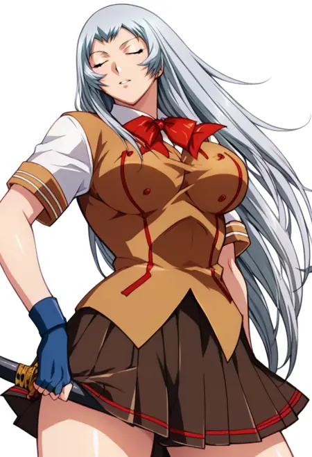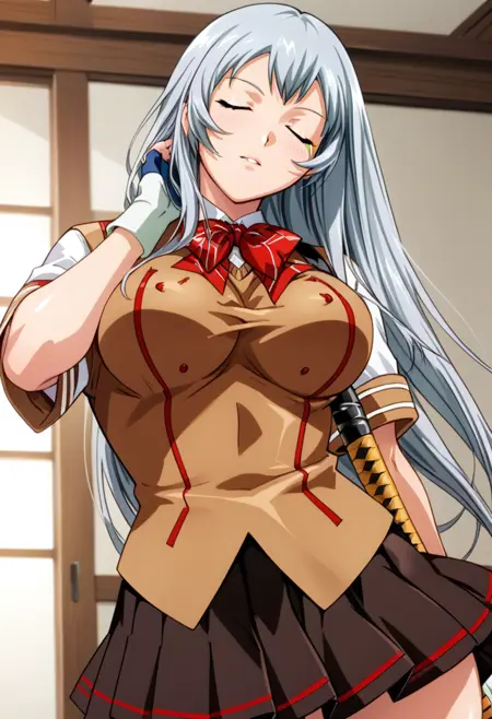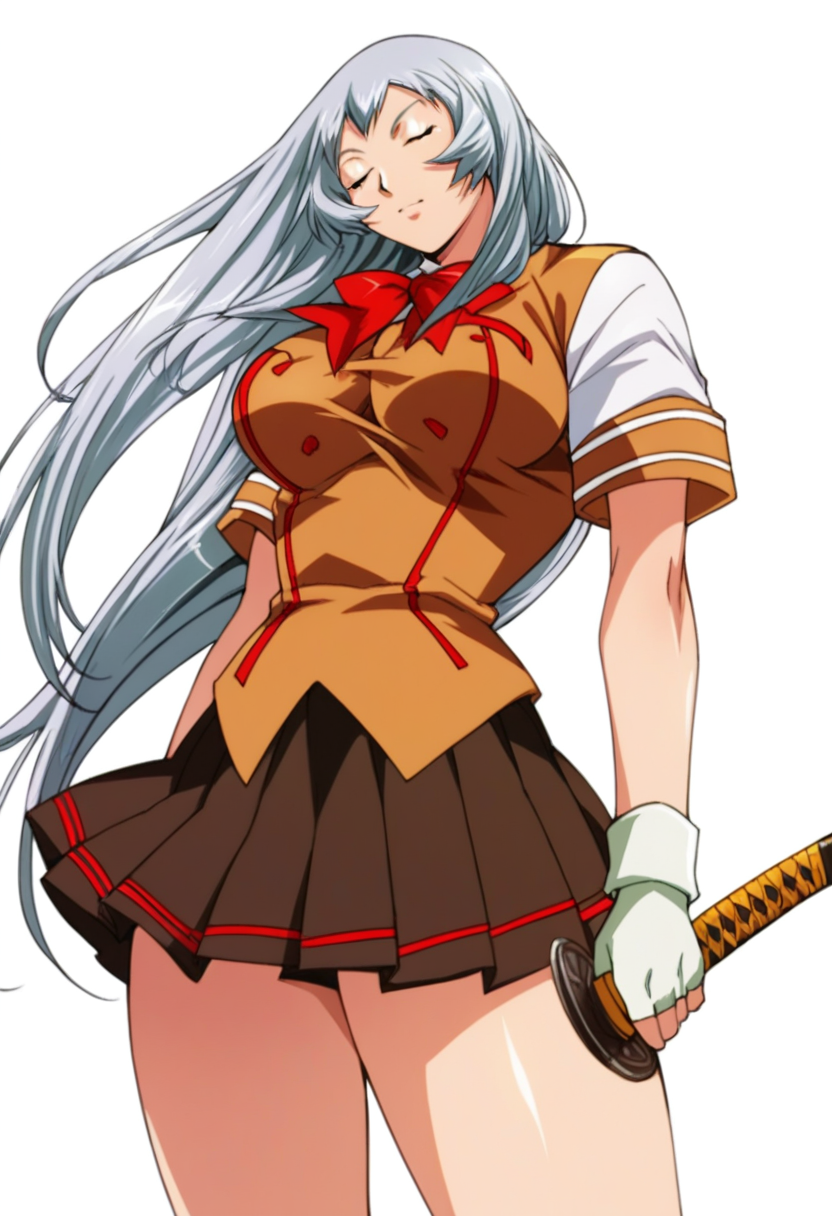 chou-un-i, long hair, grey hair female, closed eyes, large breasts, school uniform, skirt, katana, fingerless gloves
