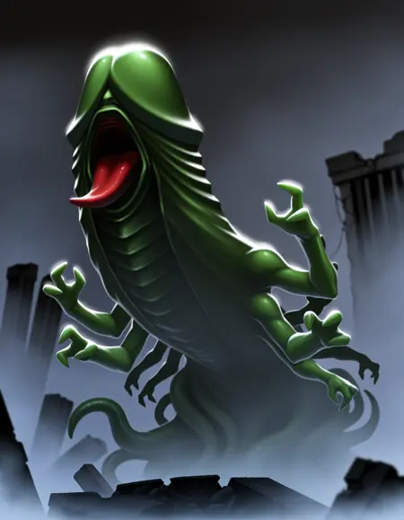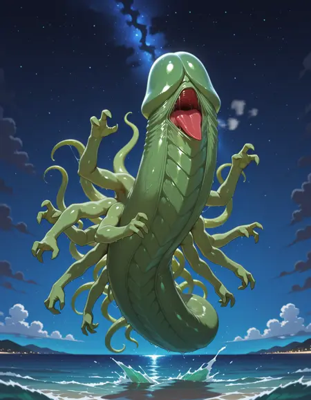 Appearance: mara-sama, green skin, monster tongue, green tentacles,