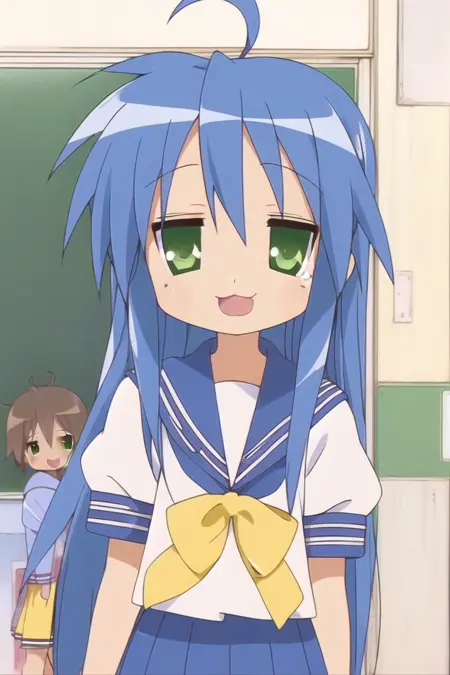 伊吹 ここた: (izumi konata, 1girl, solo, ryouou school uniform, school uniform, long hair, mole, mole under eye, yellow bowtie, serafuku, bow, bowtie, green eyes, yellow bow, blue hair, ahoge, short sleeves, sailor collar)