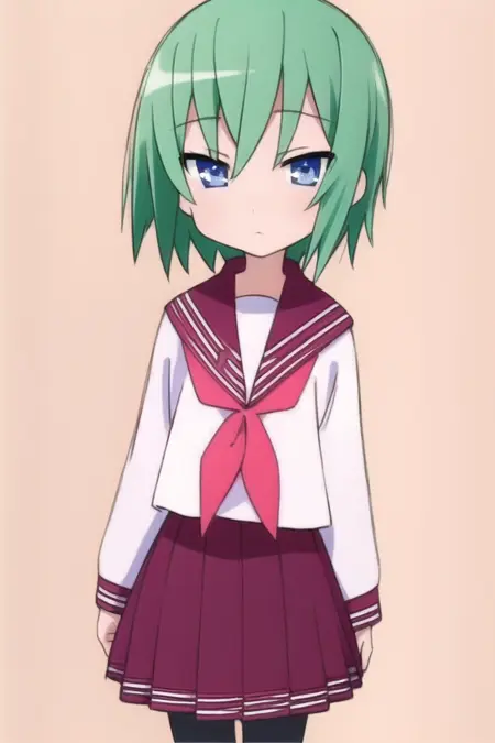 岩崎 美波: (iwasaki minami, 1girl, solo, pantyhose, expressionless, ryouou school uniform, school uniform, neckerchief, serafuku, pink neckerchief, green hair, blue eyes, short hair, skirt, red neckerchief)