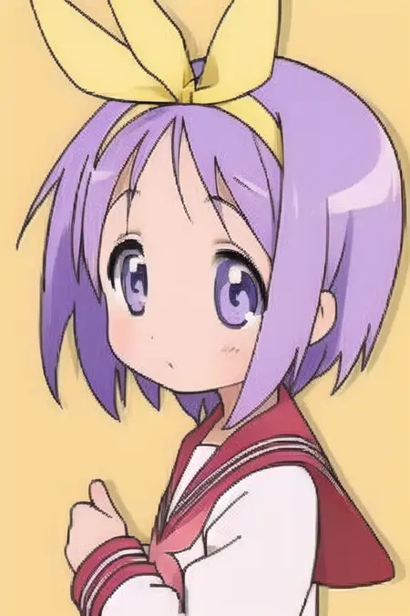 日影 琉夏: (hiiragi tsukasa, 1girl, solo, school uniform, ryouou school uniform, serafuku, short hair, purple hair, yellow hairband, ribbon)