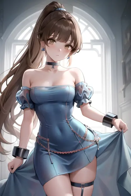 ArielNowhere, 1girl, solo, very long hair, medium breasts, light brown hair, blue dress, jewelry, bare shoulders, brown eyes, high ponytail, short sleeves, earrings, choker, puffy sleeves, strapless, thigh strap, short dress, cuffs, blunt bangs, see-through,