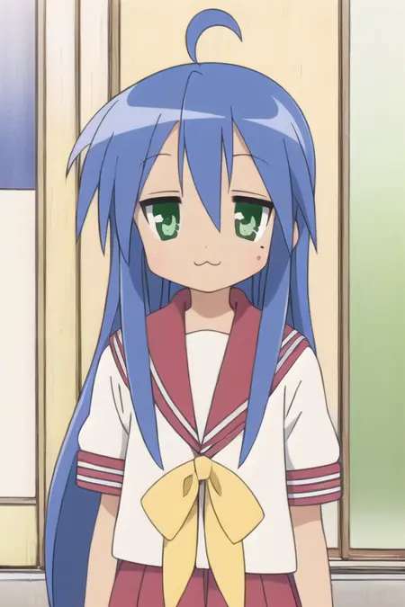 코나타 이즈미: (izumi konata, 1girl, solo, 료오우 학교 정장, 학교 정장, 긴 머리카락, 턱밑 반점, 눈 밑 반점, 노란 리본 넥타이, 세라포, 리본, 넥타이, 녹색 눈, 노란 리본, 파란 머리카락, 아호게, 짧은 소매, 선장-collar)