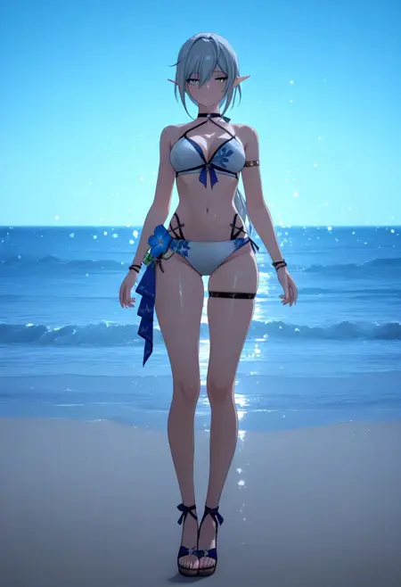 cael_rws, silver-gray long hair tied in a low ponytail with a dark blue ribbon, short side bangs framing face, pale elf with long pointed ears, gray eyes