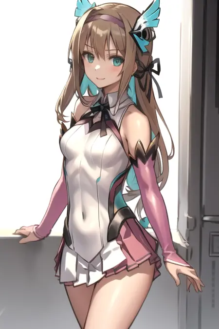AuricaNestmile, 1girl, solo, long hair, medium breasts, aqua eyes, miniskirt, light brown hair, hair ornament, elbow gloves, dress, ribbon, bare shoulders, hair ribbon, pleated skirt, hairband, detached sleeves, black ribbon, long sleeves,