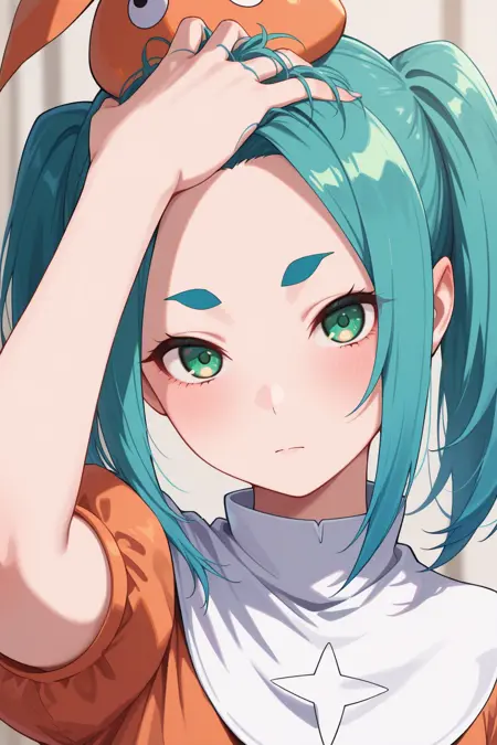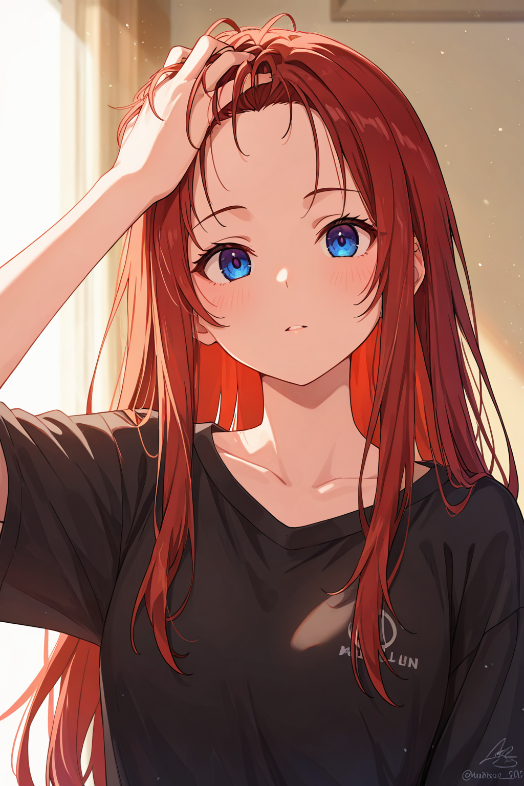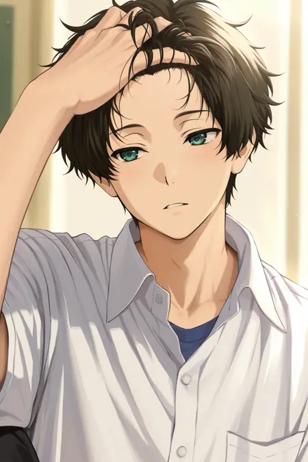 hand in own hair, forehead