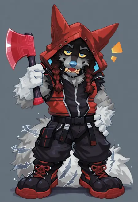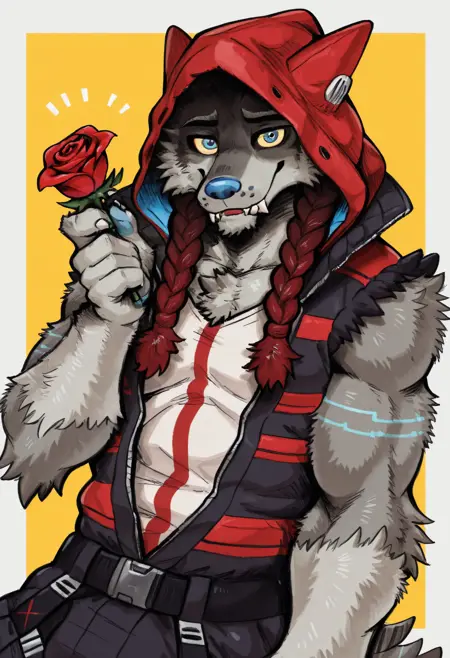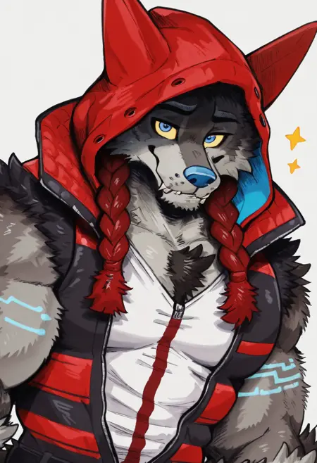 Illustrious: best quality, amazing quality, very aesthetic, absurdres, hires, r3d_h00d, furry, furry male, 1boy, solo, bara, braid, blue nose, blue eyes, yellow sclera, shap teeth, fangs, jacket, hood, sleeveless jacket, ...your tags...