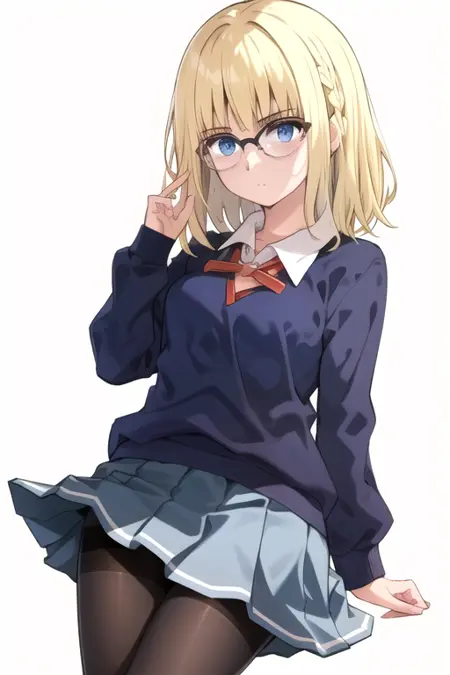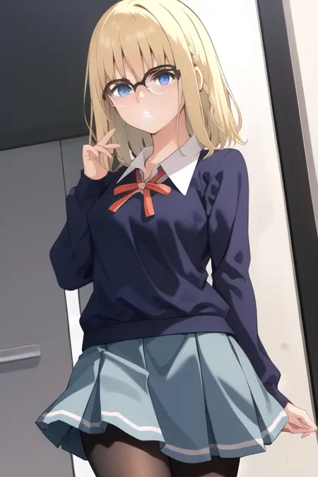 AyakaFSF, 1girl, solo, medium hair, blue eyes, pleated skirt, blonde hair, long sleeves, school uniform, black pantyhose, glasses, medium hair, blue sweater, grey skirt, collared shirt, red ribbon, closed mouth, miniskirt