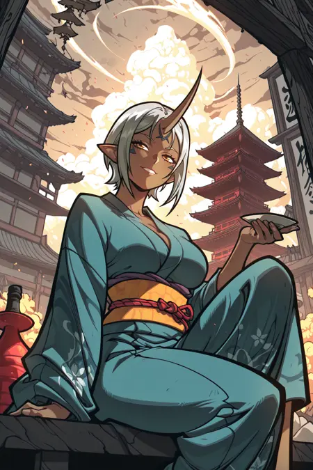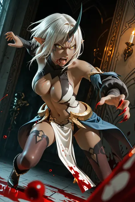 触发词:Yulriga,深色皮肤女性,短发,灰发,单角,尖耳,黄眼睛,竖瞳,面部纹路,裸露肩膀,吊带装,敞开式紧身衣,乳沟,肚脐,分离式袖子,新郎手套,护臀甲,(蓝色尖刺裙:1),(白色骨盆帘:2),黑色与红色过膝长筒袜,高跟靴