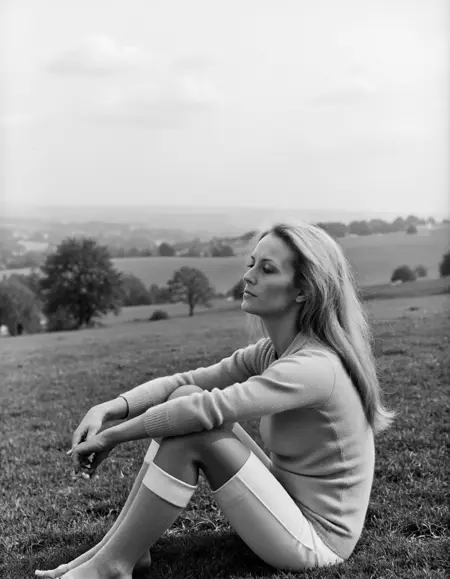 長い波状の髪をした女性が床に座り、ストライプのドレスに幅広のベルト、膝丈ブーツを履いている写真。黒白のストジオバックドロップに、terry-oneillのスタイルで