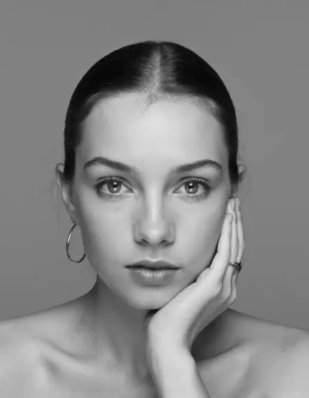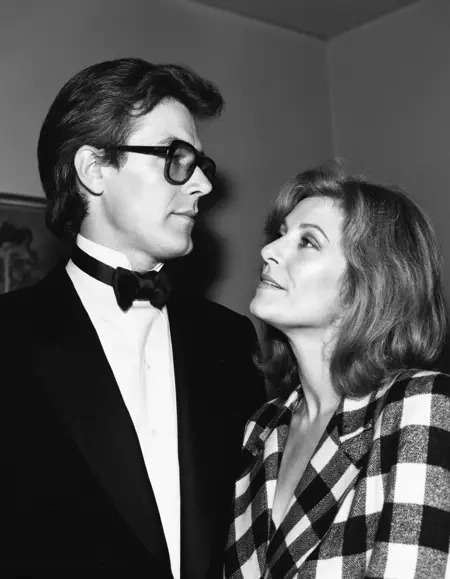 黒白の設定で微笑む女性の写真。広いつばの帽子と、肩に白いオウムが止まっているセーターを着て、背景は柔らかくぼかされており、遠くにチェック柄のもう一人の人物が部分的に映っている。terry-oneillのスタイルで