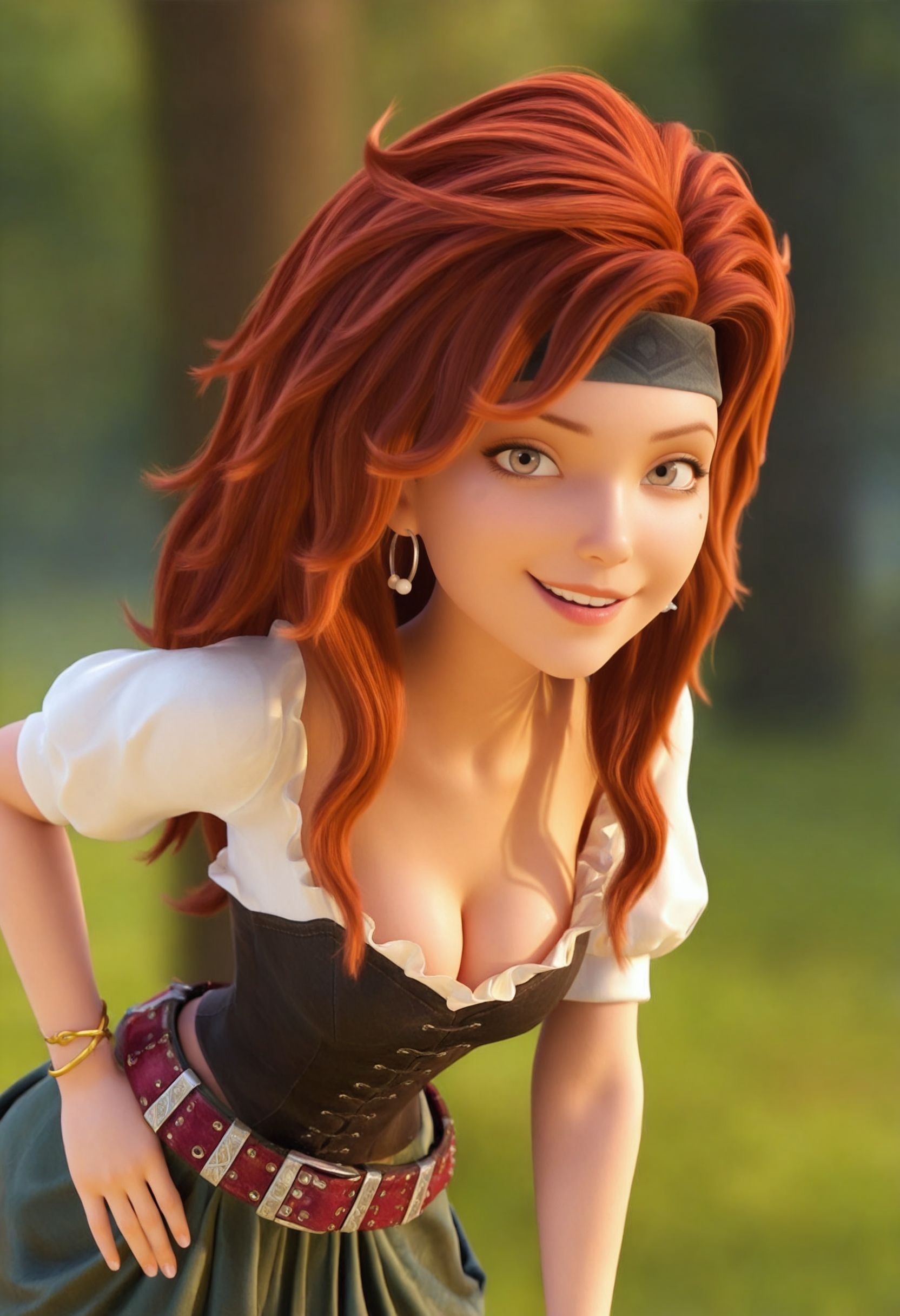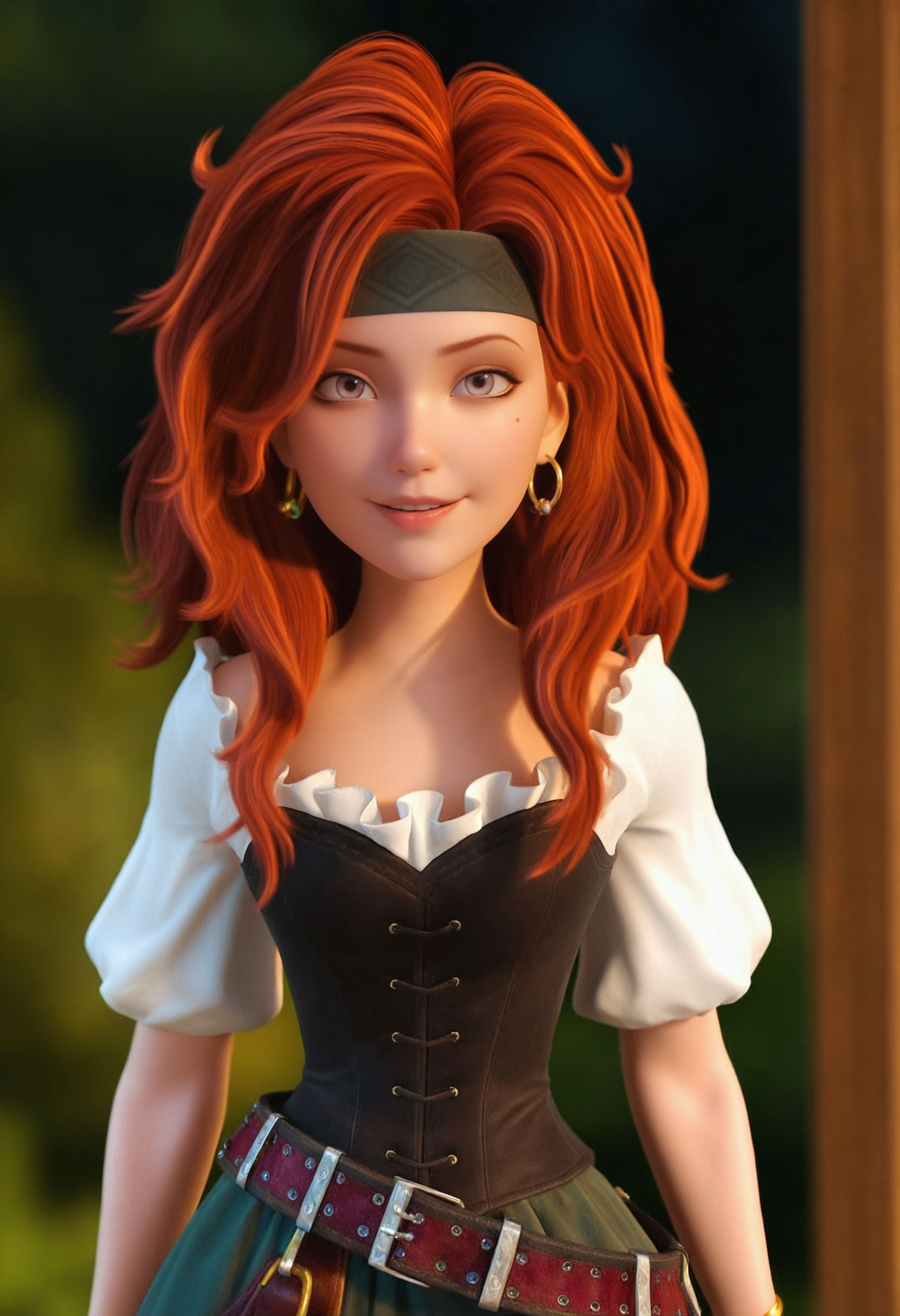 옷: 흰색 셔츠, 검은색 코르셋, 녹색 치마, 금색 팔찌, 벨트, 퍼프 짧은 소매, 짧은 소매