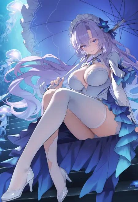 トリガーワード:smktll,1girl,long hair,breasts,blue eyes,purple hair,hair between eyes,jewelry,large breasts,cleavage,white dress,earrings,hair ornament,white thighhighs,flower,very long hair,hair flower,maid headdress,blue flower,clothing cutout,jellyfish,long sleeves,single thighhigh,nail polish,garter straps