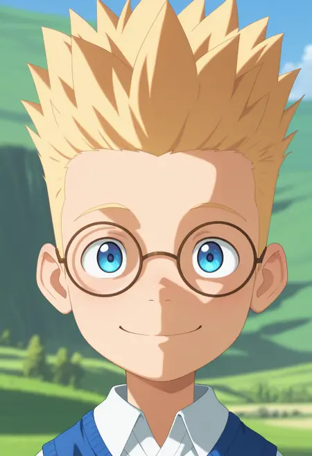 lewis, blonde hair, blue eyes, short hair, glasses, spiked hair