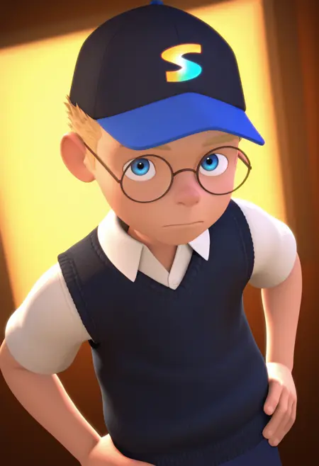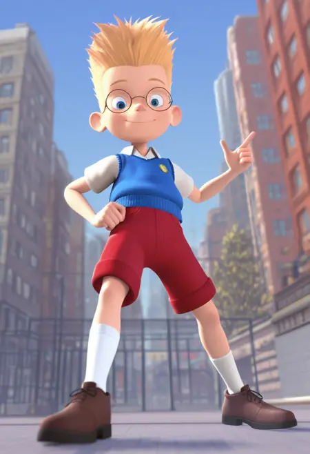 lewis_robinson, blonde hair, blue eyes, short hair, glasses, spiked hair,