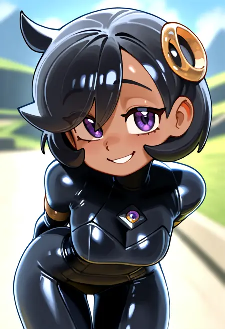 キーワードはemmaza、デフォルトの衣装には:黒髪、短髪、濃い肌、濃い肌の女性、前髪、紫の目、髪飾り、ジャケット、黒いボディスーツ