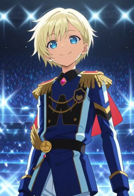 1소년, 남성 중심, 단독, 파란 눈, 금발, 아이돌 복장, 어깨장식, 짧은 망토, 빨간 망토, 파란색 및 흰색 재킷, 벨트, 흰색 바지, 파란 장갑, 손가락 없는 장갑, 부츠,