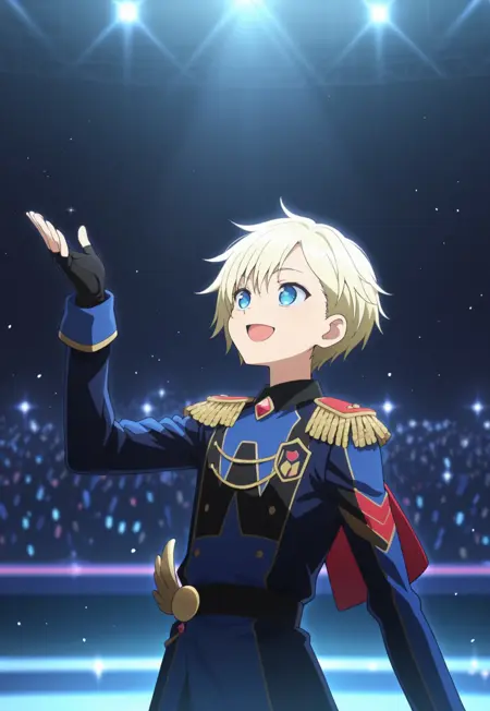 1소년, 남성 중심, 단독, 파란 눈, 금발, 아이돌 복장, 어깨장식, 짧은 망토, 빨간 망토, 파란색 및 검은색 재킷, 벨트, 검은 바지, 검은 장갑, 손가락 없는 장갑, 부츠,