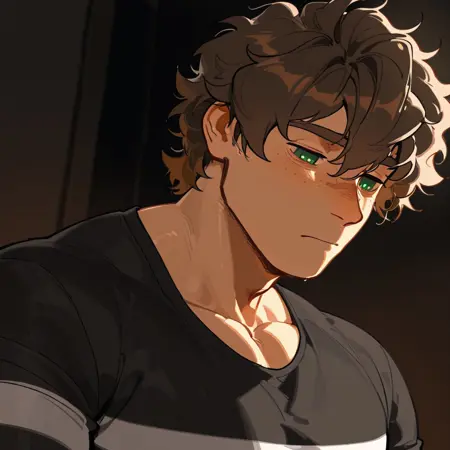 EvanA, brown hair, messy hair, green eyes, tired eyes, freckles, scar on face, black shirt with white stripes, buff, tired eyes, male