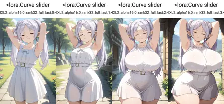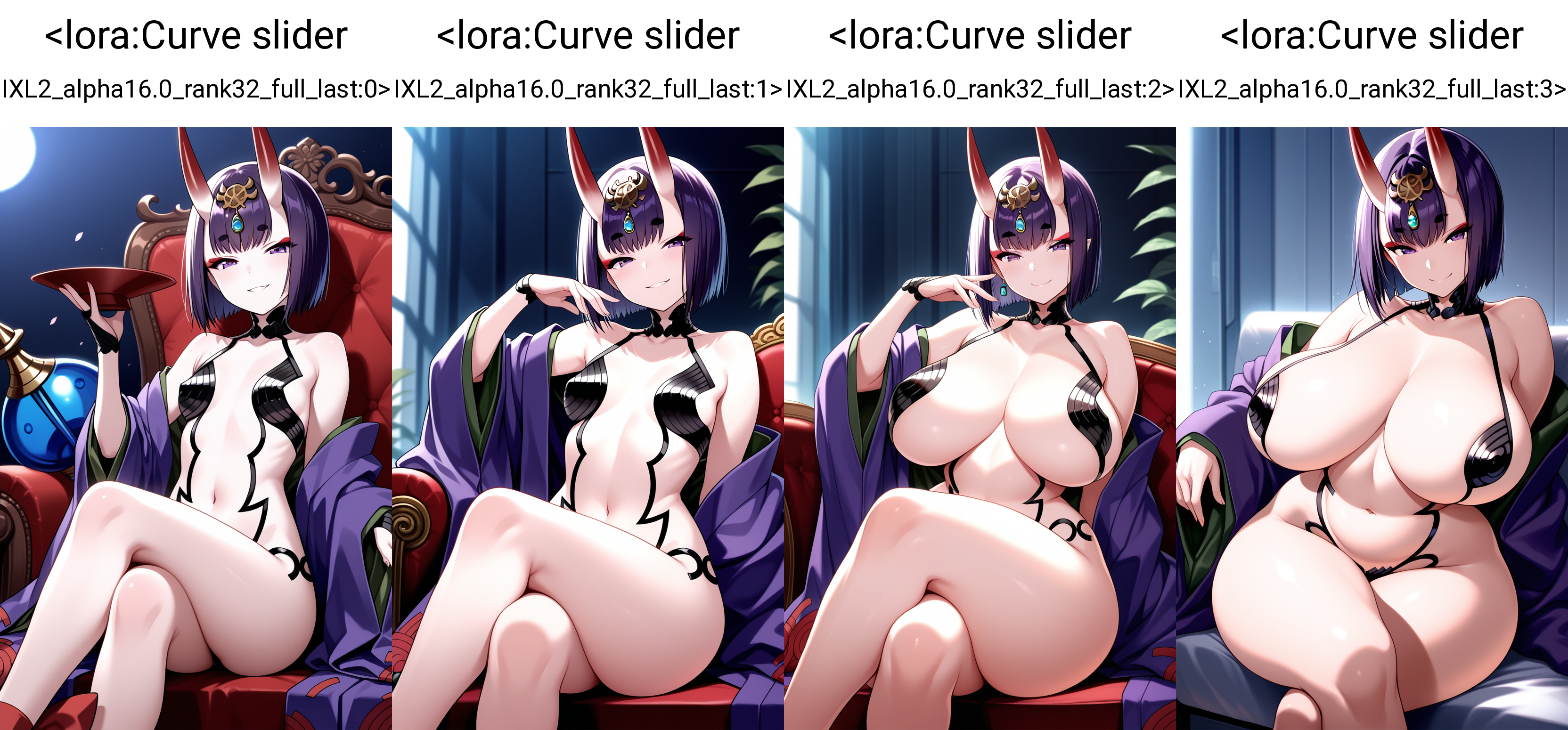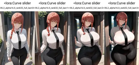 这是一个可调节权重的 LoRA——你可以自由选择任意权重,建议尝试并找出最适合你的设置。正权重会使女性角色曲线更丰满。你也可以使用更高的权重,例如 8 及以上——具体效果取决于角色和检查点。