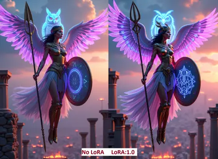 이 LoRA는 고대 서사시와 미래적 비전을 하나로 연결합니다: 네온 번개를 휘두르는 제우스, LED 뱀을 지휘하는 메두사, 사이버네틱 타이탄과 맞서는 아킬레스, 그리고 아크로폴리스 같은 도시들이 빛나는 싱스웨이브 스카이라인으로 재건되는 장면들.