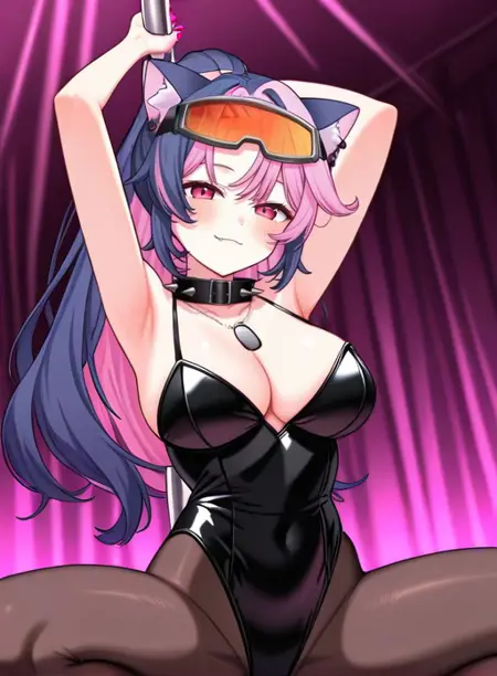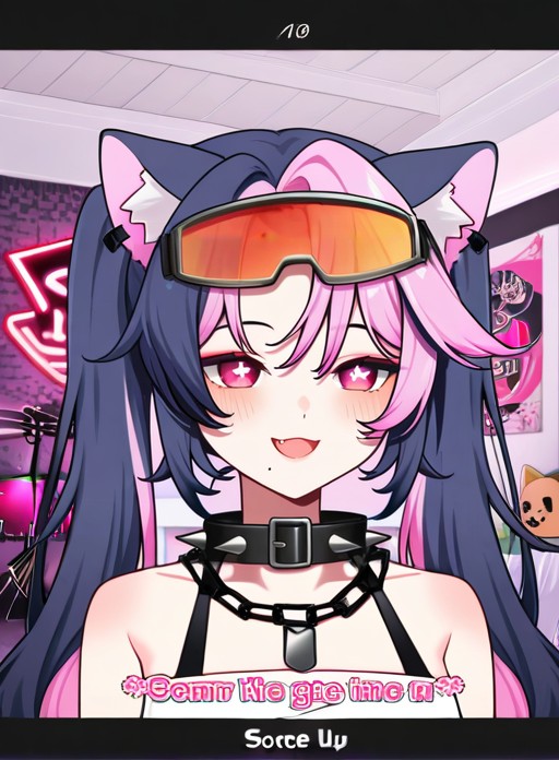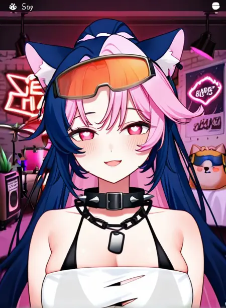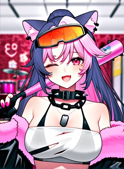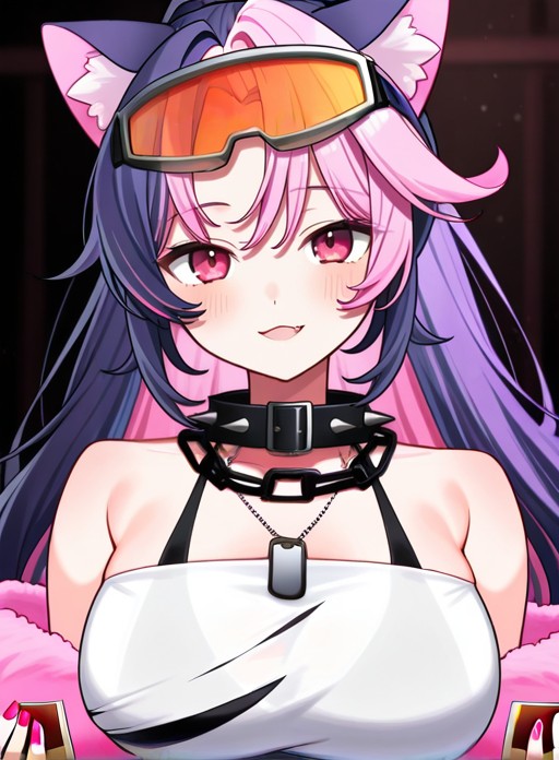 ShuraHiwa, 긴 머리, 가슴, 큰 가슴, 빨간 눈, 잡고 있는, 동물 귀, 분홍색 머리, 포니테일, 다색 머리, 초커, 가상 유튜버, 강아지 이빨, 고양이 귀, 분홍색 눈, 목걸이, 네일아트, 이색 머리, 스트라이프 머리, 칼라, 동물 귀 털, 검정 초커, 고글, 머리에 착용한 안경, 개 귀, 분홍색 손톱, 스파이크, 머리에 착용한 고글, 검정 칼라, 스파이크 칼라, 독일 목표, 색안경, 보라색 머리