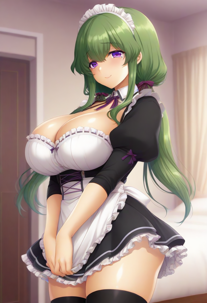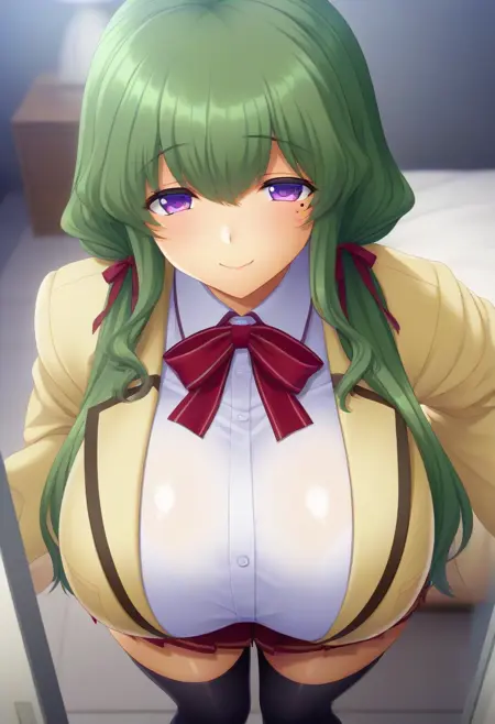 推荐提示词:仁藤友惠,紫色眼睛,眼下一颗痣,绿色长发,低双马尾,发带,