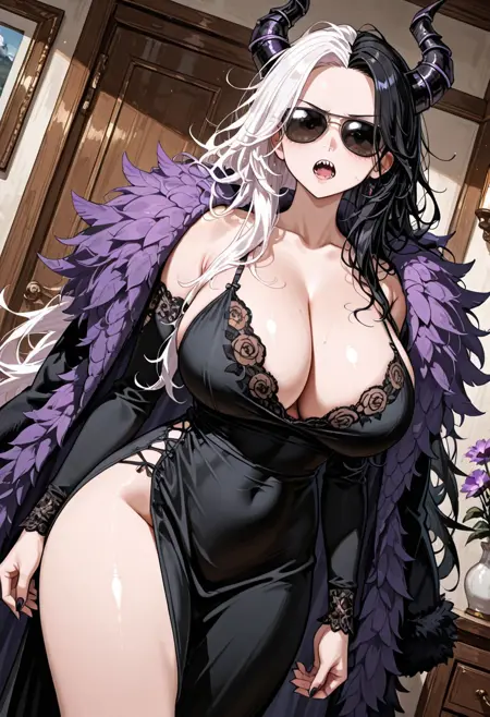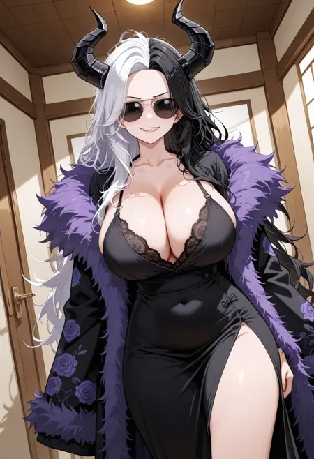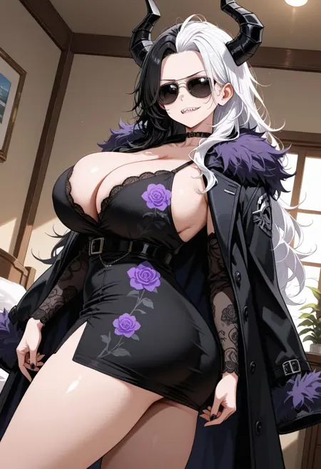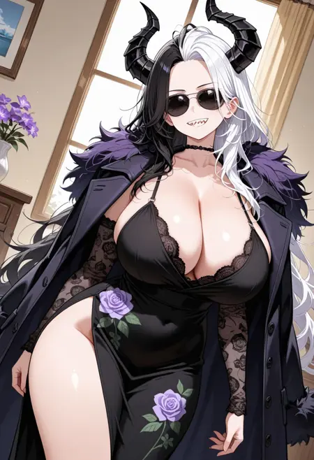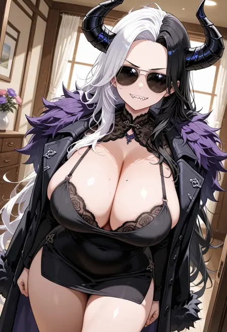 MAFFEY , 1girl , Split-Color Hair , Two-Tone Hair , black hair , white hair ,covered eyes , sunglasses , huge breast, sharp teeth , cleavage , purple feather coat