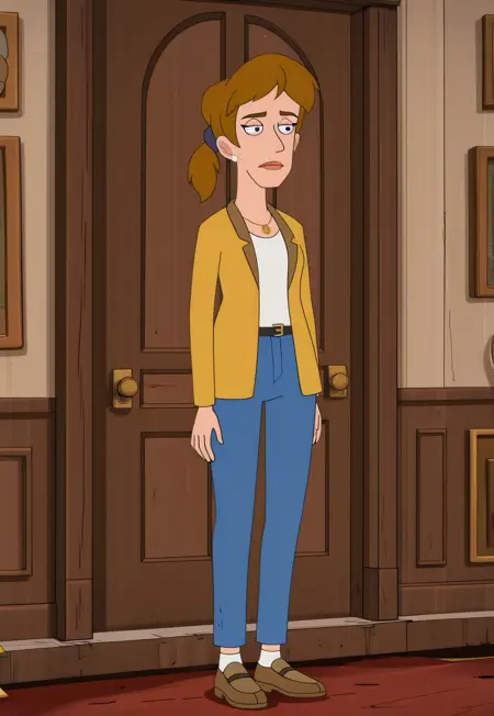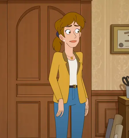 1woman, 2d, cartoon, Katherine from Haunted Hotel 2025, white earrings, gold necklace, brown hair tied in a ponytail, yellow jacket over a white shirt, black belt, blue pants, white socks, brown shoes