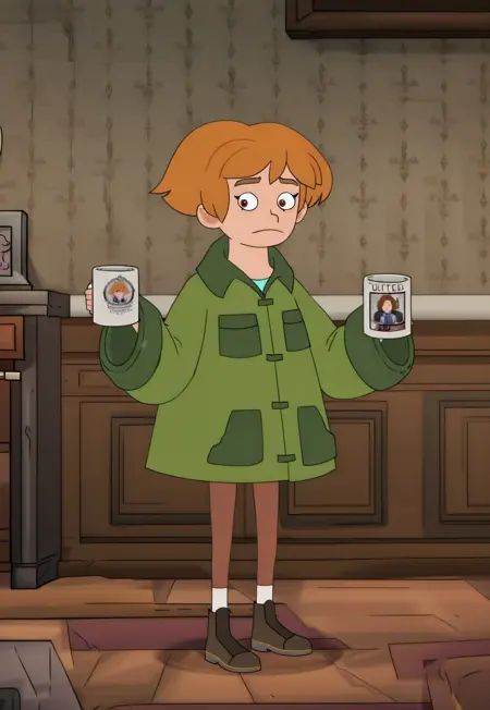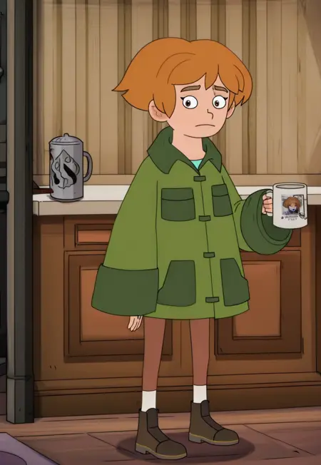 1girl, 2d, cartoon, Esther from Haunted Hotel 2025, short orange hair, brown eyes, slender build, green oversized jacket, brown leggings, dark brown boots, white socks