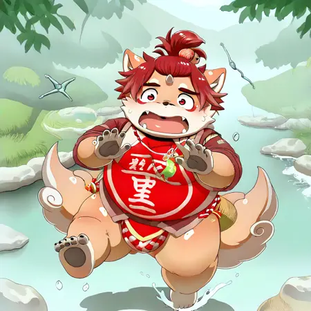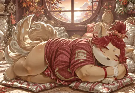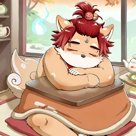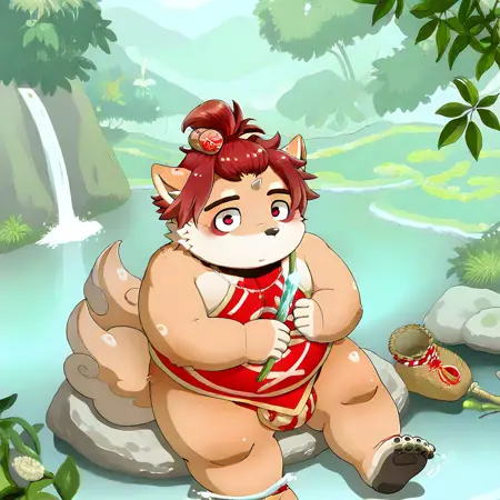 狐の精の少年、ケモノ、人型狐、フューリー、ぽっちゃり、がっしり、バラ、薄茶色の毛、タン色の毛、ツートンカラーの毛、