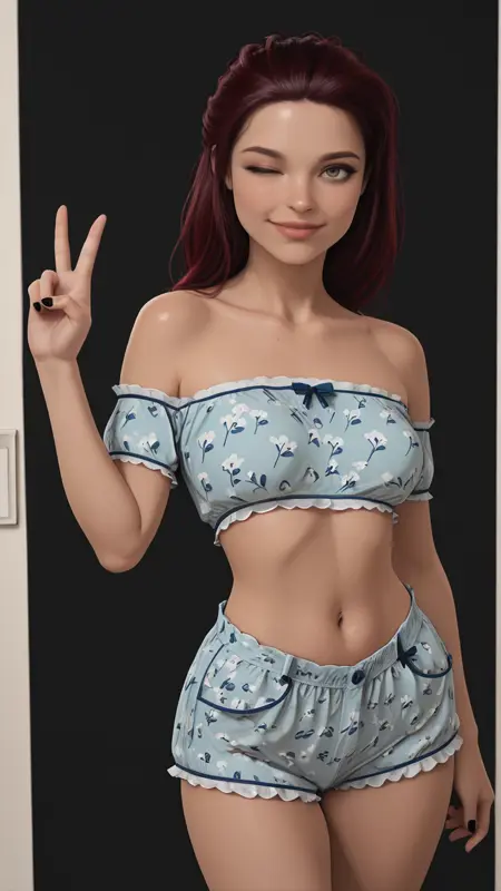 밝은 파란색 크롭 탑, 플로럴 프린트, 흰색 꽃, 탑에 파란색 안감, 가슴에 작은 파란색 리본, 스트랩리스, 어깨 노출, 짧은 소매, 프릴 트림, 복부 노출, 밝은 파란색 파자마 반바지, 짧은 반바지, 파자마 반바지에 파란색 안감, 엉덩이에 작은 파란색 리본