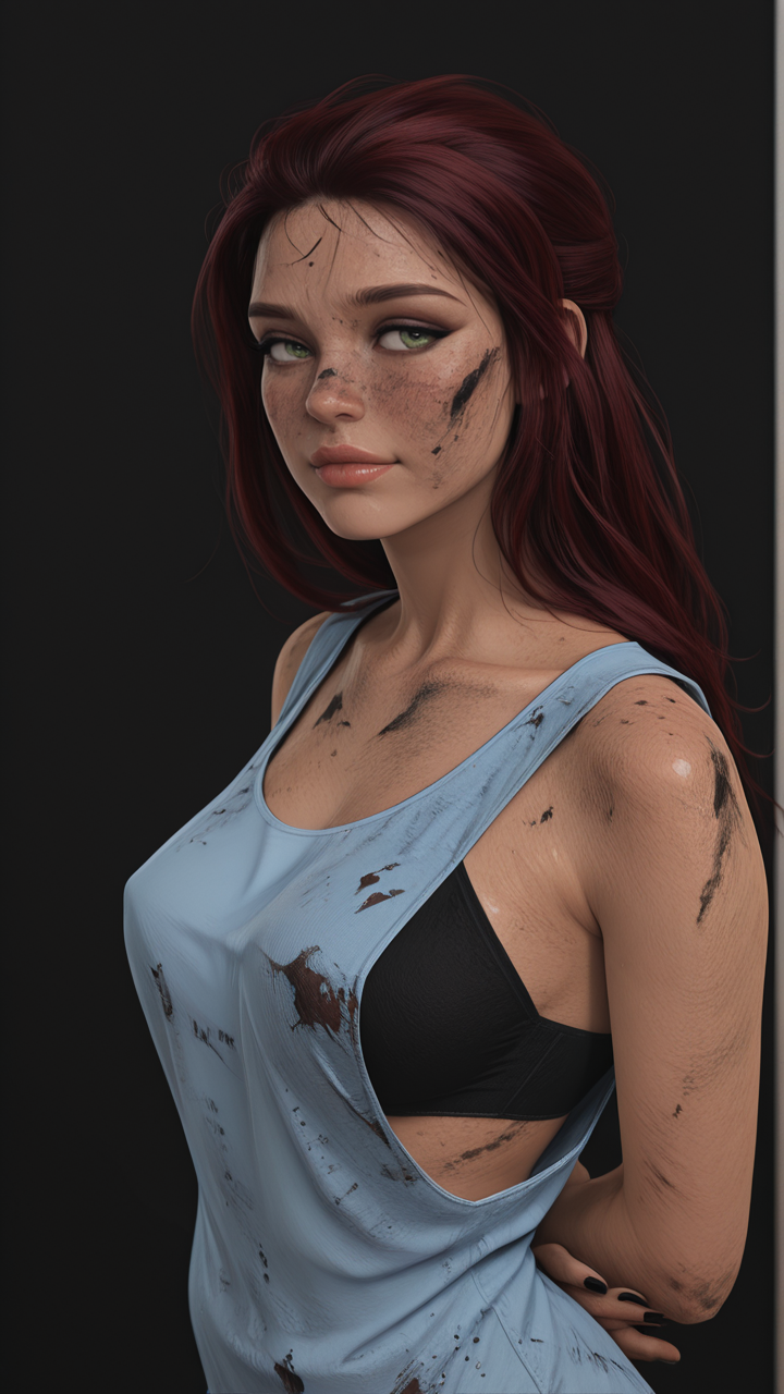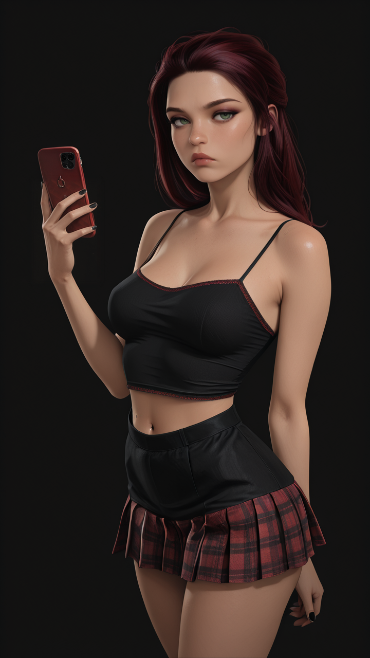 lucy_atc、緑の目、濃い赤髪、中程度の髪の長さ、後ろに流された髪、ほつれた髪の毛、眉、唇、リップストック、アイシャドウ、中程度の胸、黒いネイルポリッシュ、ピアスを開けたへそ、